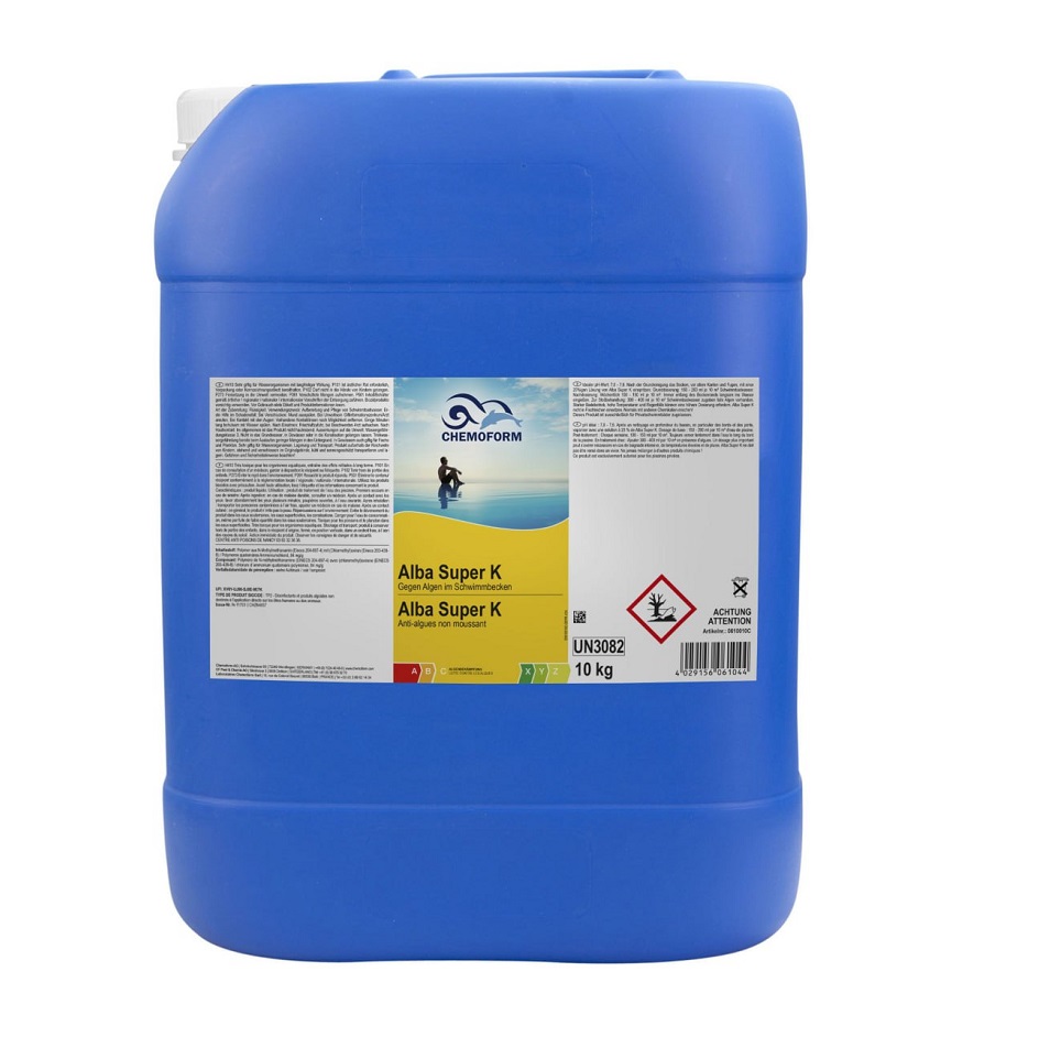 Оптимальный уровень рН: 7,0-7,4. После чистки бассейна перед его наполнением следует нанести 1%-ый раствор “Альба Супер К” на поверхность чаши бассейна для уничтожения сохранившихся и уже появившихся грибков и водорослей. Дозировка: для первичной обработки необходимо 150мл альгицида на 10м³ воды. Затем каждые 14 дней добавлять по 100мл на 10м³ воды. При высоких температурах и осадках дозу следует увеличить.